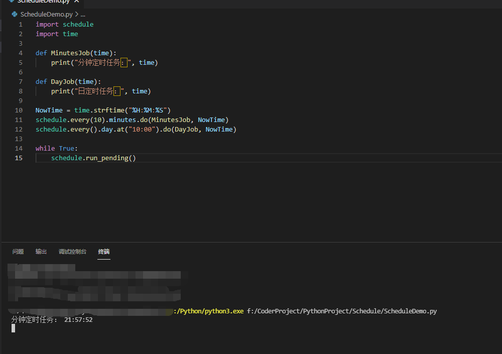 1 2 3 4 5 6 7 8 9 10 11 12 13 14 15 16 17 18 19 20 21 import scheduleimport timedef MinutesJob (time ): print ("分钟定时任务:" , time) def DayJob (time ): print ("日定时任务:" , time) NowTime = time.strftime("%H:%M:%S" ) schedule.every(10 ).minutes.do(MinutesJob, NowTime) schedule.every().day.at("10:00" ).do(DayJob, NowTime) while True : schedule.run_pending()