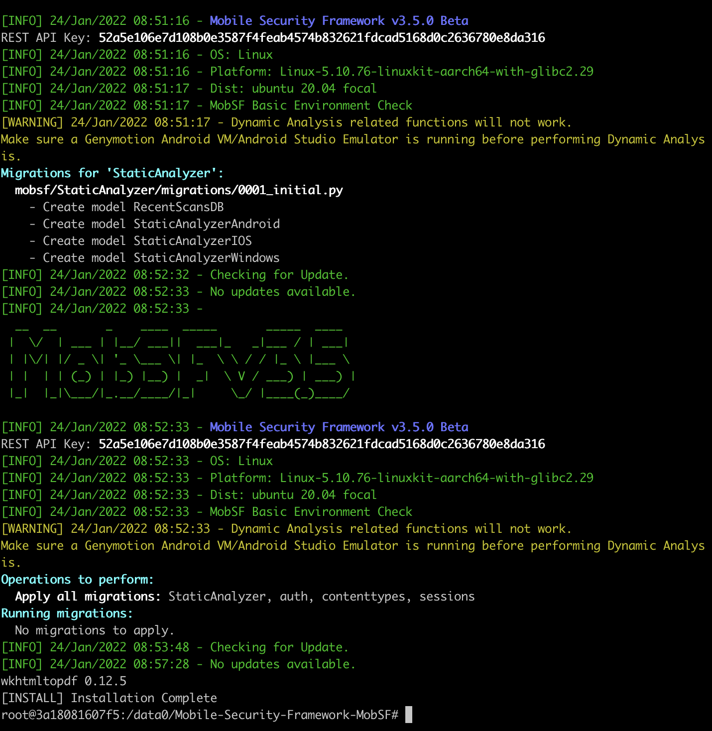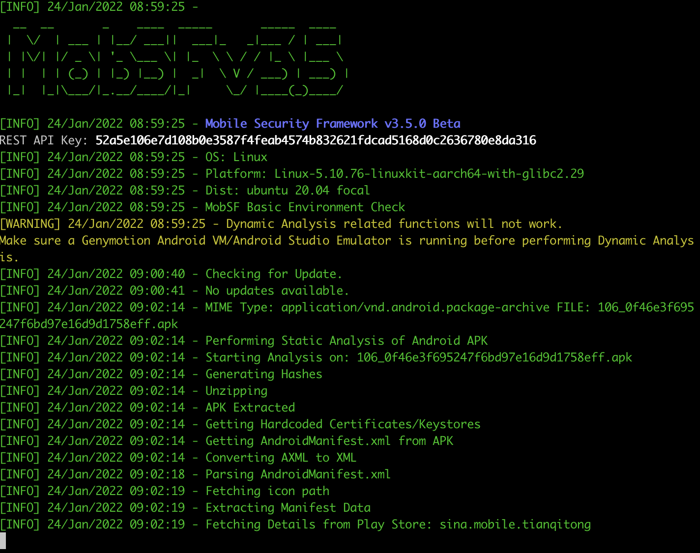 docker run -itd --name MobSF -p 8081:8000 ubuntu:latest