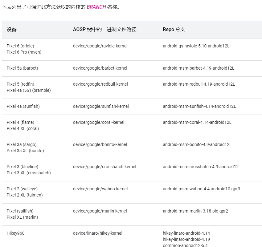 注意:kernel 的下载不是根据网上别人下载什么自己下载什么,而是根据自己的手机型号去下载内核,此处提供官方的俩个表格供大伙选择(仅google系的手机,非google系的手机请移步参考文档 - 手机内核wiki )